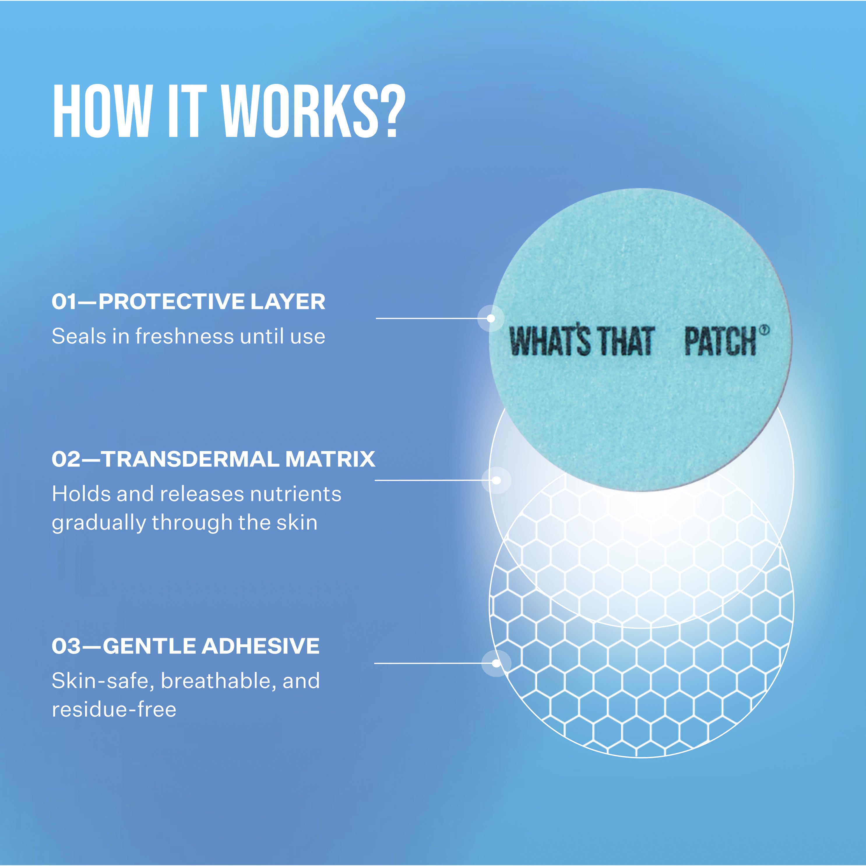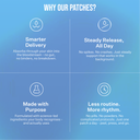 Our patches release carefully selected ingredients through your skin, delivering targeted well-being benefits directly into your bloodstream over 6–8 hours. By bypassing the digestive system, they ensure a steady, controlled effect—avoiding the peaks and dips of traditional methods. It’s wellness, simplified and sustained.